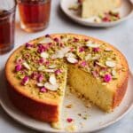 Persian Love Cake is a fragrant, moist dessert infused with rose water, cardamom, and saffron. This delicate cake combines the nutty flavors of almond and semolina flours, finished with a sweet honey-orange syrup that soaks beautifully into every bite.