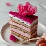 A slice of layered cake is shown on a white plate with a white marbled surface underneath. The cake has five visible layers, starting with a light brown soft cake layer at the bottom, followed by a pale pink creamy layer, then a darker brown cake layer, another pale pink creamy layer, and topped with a final layer of pink dragon fruit flesh with tiny black seeds. On top, there is a bright pink flower decoration with delicate petals. A woman's hand holding a small fork is placed near the plate. The overall look is soft and colorful with clear contrast between each layer. photo taken with an iphone --ar 4:5 --v 7