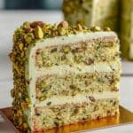 - Decorate the Cake: Press the chopped pistachios onto the sides of the cake, then sprinkle some over the top. For an elegant finish, garnish with white chocolate shavings or edible gold leaf if desired.