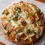 This Pull-Apart Cheese Bread is a delicious and easy appetizer featuring a crusty loaf of bread sliced into a diamond pattern, generously stuffed with melted mozzarella, parmesan cheese, garlic butter, and parsley. Baked until golden and bubbly, it’s perfect for sharing and dipping into marinara sauce.