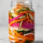 This Quick Fridge Pickled Vegetables recipe is a simple and refreshing way to add a tangy crunch to your meals. Using a blend of vinegar, water, and aromatic spices, fresh shredded carrots, radish, cucumber, and red onion are quickly pickled in a few easy steps. Ready to enjoy in just 17 minutes, these pickled veggies are perfect as a snack, side dish, or topping for salads and sandwiches.