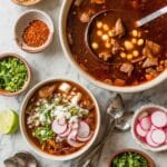 Red Pozole (Pozole Rojo) is a traditional Mexican hominy stew made with tender pork shoulder simmered in a rich, flavorful broth infused with dried guajillo and ancho chiles. This hearty dish is garnished with fresh radishes, shredded cabbage, onions, cilantro, and lime wedges for a vibrant, comforting meal perfect for gatherings.
