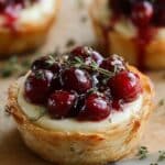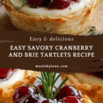 Savory cranberry and Brie tartlets are an elegant and delicious appetizer featuring creamy Brie cheese paired with tangy cranberry sauce, all nestled in flaky puff pastry shells. Ideal for holiday parties, casual gatherings, or sophisticated dinners, these bite-sized treats combine sweet, savory, and nutty flavors with a delicate herb garnish, making them an irresistible crowd-pleaser.