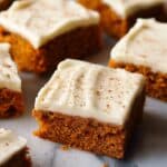 Store the pumpkin bars in an airtight container in the refrigerator for up to 5-6 days. For longer storage, freeze the unfrosted bars or sliced portions for up to 3 months. Thaw overnight in the refrigerator before frosting or serving. Leftover frosted bars can be refrigerated and consumed promptly for best texture.