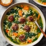 Keywords: Italian Wedding Soup, meatball soup, comforting soup, quick Italian soup, weeknight dinner, homemade meatballs, acini di pepe soup, spinach soup