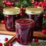 Keywords: Christmas jam, spiced jam, holiday preserves, peach jam, cranberry jam, homemade jam, fruit spreads