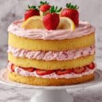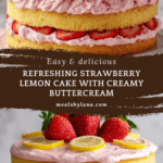 Keywords: Strawberry lemon cake, lemon cake, strawberry buttercream, layered cake, citrus dessert, homemade cake