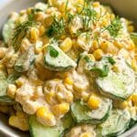 A refreshing and creamy street corn salad featuring grilled corn kernels combined with crisp cucumber, red onion, and fresh cilantro, all tossed in a zesty Greek yogurt and mayonnaise dressing with a hint of lime and chili powder. Perfect as a light side dish or summer salad.