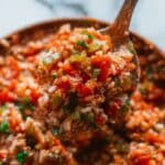 A close-up view of a ladle full of cooked rice mixed with ground beef, diced red bell peppers, chopped tomatoes, and small green herbs, all soaked in a rich reddish-brown broth. The rice grains are soft and slightly glossy, blending well with the tender meat and vegetables. The background shows more of the same mixture in a white pot with a warm, steaming effect. The colors range from the red of tomatoes and peppers, brown of the meat, white of the rice, to green herbs sprinkled throughout. The scene is set on a white marbled surface, giving a fresh and clean look. Photo taken with an iphone --ar 4:5 --v 7