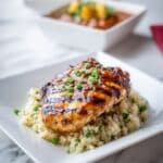 This Sweet Chili Coconut-Lime Grilled Chicken recipe features juicy chicken breasts marinated in a flavorful sweet chili and coconut milk blend, then grilled to perfection. Served over aromatic sautéed cauliflower rice infused with coconut, lime, and fresh cilantro, this dish balances tropical flavors with a touch of heat, making it a delicious, low-carb, and healthy meal perfect for any occasion.