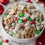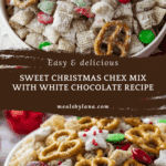 This Sweet Christmas Chex Mix with White Chocolate is a festive, crunchy snack mix combining Corn Chex, Cheerios, pretzels, mini vanilla wafers, honey roasted peanuts, and holiday M&M’s, all coated in smooth melted white chocolate and dusted with powdered sugar. Perfect for holiday parties or gifting, this no-bake treat offers a delightful combination of sweet and salty flavors with a colorful and festive appearance.