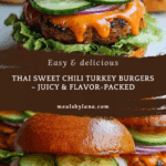This Thai Sweet Chili Turkey Burgers recipe combines lean ground turkey patties with a glossy, sweet-spicy Thai sweet chili glaze, fresh herbs, and crisp vegetables. Cooked on the stovetop to achieve a caramelized crust and topped with a tangy, vibrant sauce, these burgers offer a perfect balance of bold Southeast Asian flavors with the familiar comfort of a classic burger. Quick to prepare and easy to customize, it’s an ideal healthy weeknight dinner with an exotic twist.