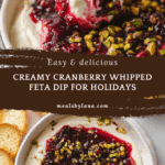 A festive and creamy cranberry whipped feta dip perfect for holiday gatherings, combining tangy feta, sweet and tart cranberry compote, and crunchy pistachios for a delightful appetizer.