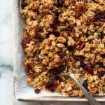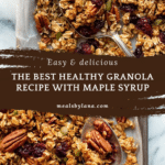 This delicious and healthy granola recipe is naturally sweetened with real maple syrup or honey and made with wholesome ingredients like oats, coconut oil, nuts, and dried fruit. Perfect for breakfast or a snack, this granola is easy to make with simple pantry staples, and yields a crunchy, flavorful treat that’s completely customizable with your favorite mix-ins.