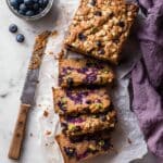 A sliced loaf of blueberry bread rests on crumpled white parchment paper over a white marbled surface, showing five pieces with a golden brown crust speckled with oats on top and a dense, moist inside full of bright purple blueberries and bits of green pistachio. Next to the loaf, there is a wooden-handled serrated knife with crumbs on the blade, and to the upper left, a glass jar filled with fresh blueberries, with a few loose berries scattered around. A soft purple cloth lies partly under the jar. photo taken with an iphone --ar 4:5 --v 7