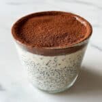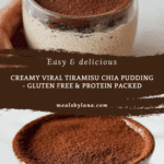 This Viral Tiramisu Chia Pudding is a gluten free, refined sugar free, high protein, and nutrient-dense recipe that mimics the classic tiramisu flavor using simple, healthy ingredients. Made with chia seeds soaked in brewed coffee and creamy Greek yogurt, sweetened naturally with maple syrup, this no-bake pudding is perfect for breakfast, a snack, or a light dessert. It’s creamy, thick, and topped with a dusting of cocoa powder for added flavor and a hint of traditional tiramisu sweetness. The recipe is dairy free and vegan adaptable and is ideal for meal prep with its single-serve jar portions.