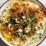 This Warm Persian Rice Bowl features caramelized onions, fragrant turmeric-spiced basmati rice with a crispy bottom crust, topped with tangy crumbled feta, fresh herbs, nuts, and optional dried barberries or cherries. A dollop of Persian yogurt salad completes this flavorful vegetarian dish that can be enjoyed as a comforting main or a side.